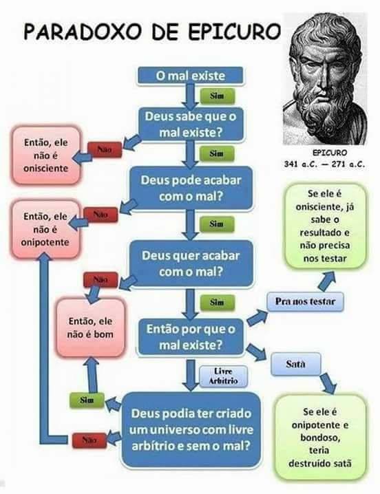 1º – Não é um ”paradoxo”. Paradoxo indica algo com conceito intrinsecamente contraditório. A proposta epicurista afirma que um deus não pode ser ao mesmo tempo onipotente, onisciente e bondoso, conforme os argumentos apresentados na figura. Paradoxo seria se houvesse a afirmação de ”deus é bom pois é cruel”, ou algo do tipo. O ”paradoxo de Epicuro” é um conjunto de argumentos em que, segundo uma vez aceitos, aí sim, a afirmação de um deus todo-poderoso e bondoso resulta num paradoxo, pois um deus não pode ter as três atribuições mencionadas concomitantemente.
