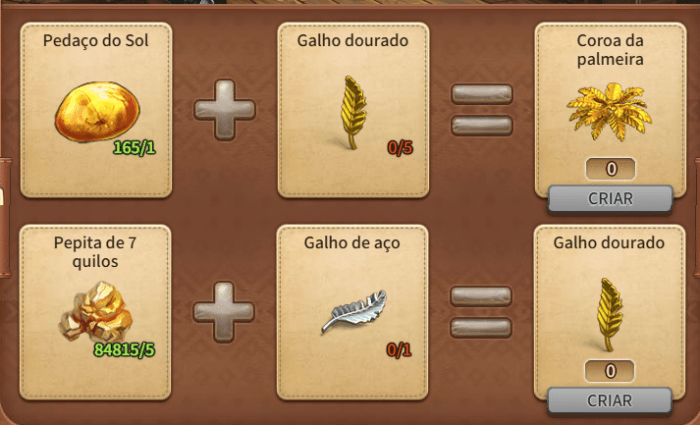 The golden Palm is a somewhat hard item to make. It needs a Piece of the Sun and specifically 25 250-ounces Gold Nuggets. While you can make the Gold Nuggets from smaller Nuggets at the Jeweller’s Workshop, the Piece of the Sun is rarely awarded as prizes from Land’s quests and Events.