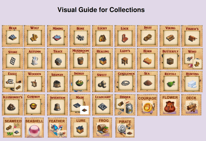 Collections are sets of multiple items that, once all item of a set are obtained, they can be exchanged for various materials, experience, or money. New players tend to struggle with raw materials (Coal, Clay, Water, Milk, Wool) and some building materials (Bricks, Tiles, Windows). These items can be earned with collections, may them be collected or received as gifts. In time, as the player increases their expedition capacity and raising of livestock, the main source of some raw materials will be Collections.
