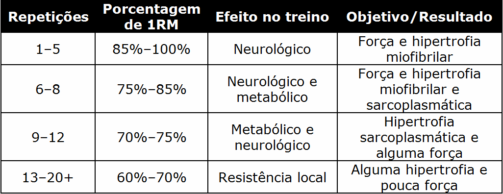 O número de repetições é uma dúvida muito comum. De forma geral (Informações mais detalhadas em The Kinesiology of Exercise de Michael Yessis), temos que: